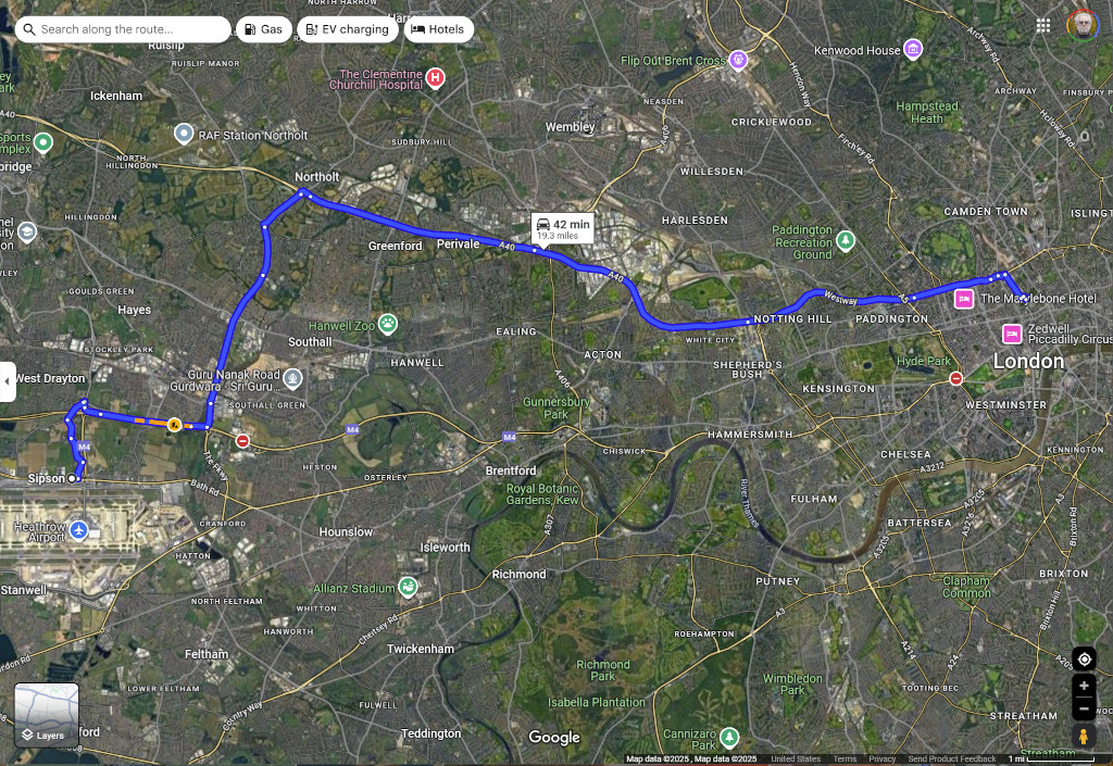 ![]() We took an Uber from the airport to the Leonardo Hotel London Heathrow Airport where we checked in, but, obviously, our rooms wouldn't be ready until much later in the day, probably around 3:00 PM. So, after relaxing in the hotel lobby for just a short while and using the lobby bathrooms to get cleaned up a bit, we headed outside to await an Uber to begin our first day in London. It arrived around 8:45. |