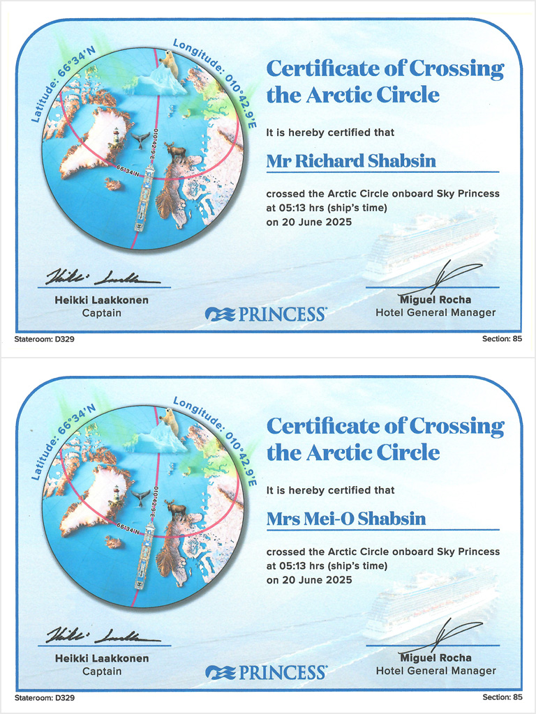 ![]() We weren't due to dock in Honningsvåg until 11:00, so, awakening early, I took a few pictures as we were getting close. Overnight, sailing from Trondheim to Honningsvåg, we crossed the Arctic Circle (cross off another bucket list item!), and to commemorate the occasion, we got these. |