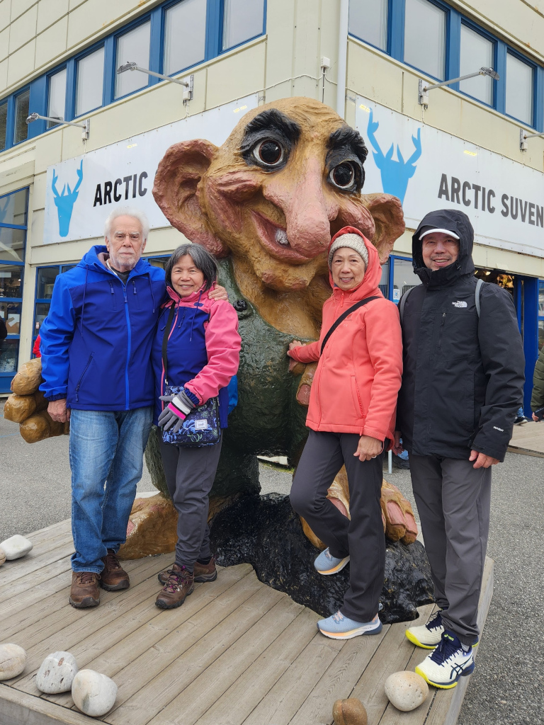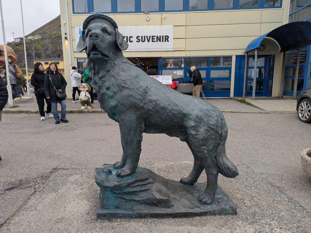 ![]() Teresa had the information we needed to find the tour's departure point where we could meet our bus, so we began walking through the town to get there, passing this guynote a St. Bernard WWII war hero, honored in his hometown of Honningsvåg with this statue on the pier. |