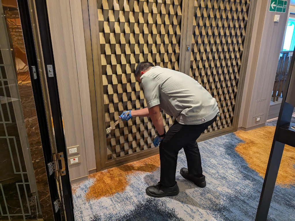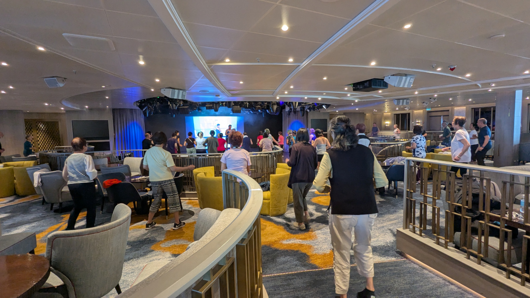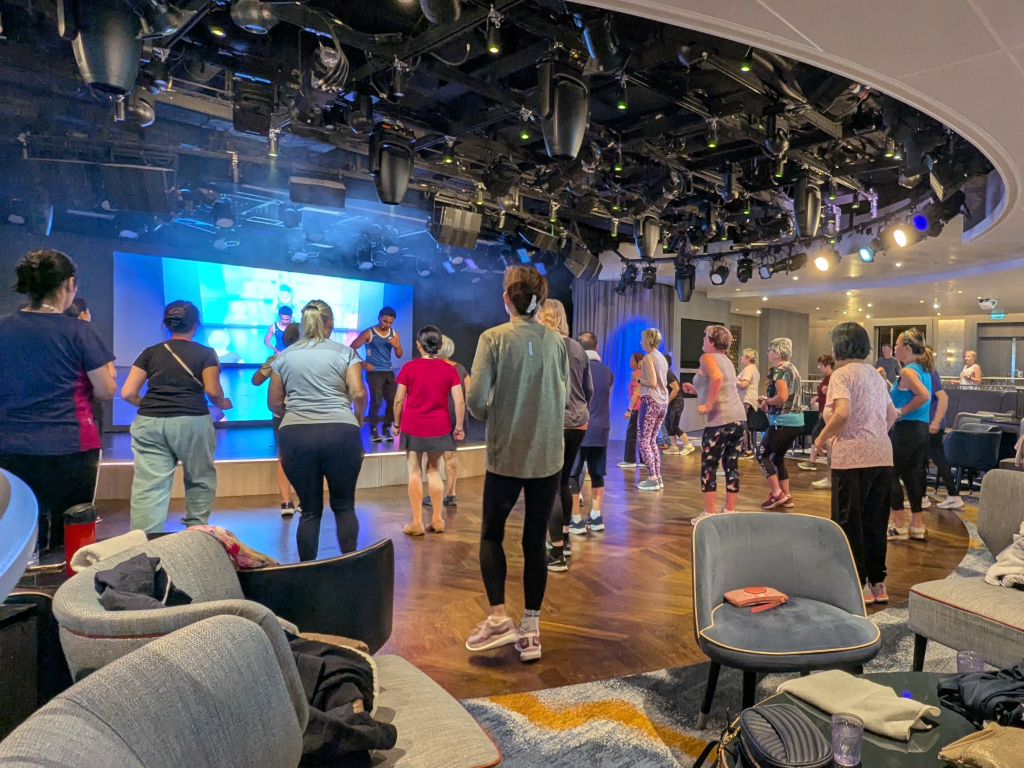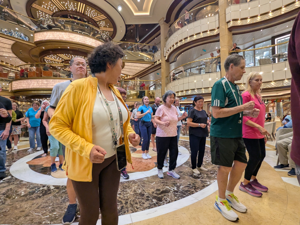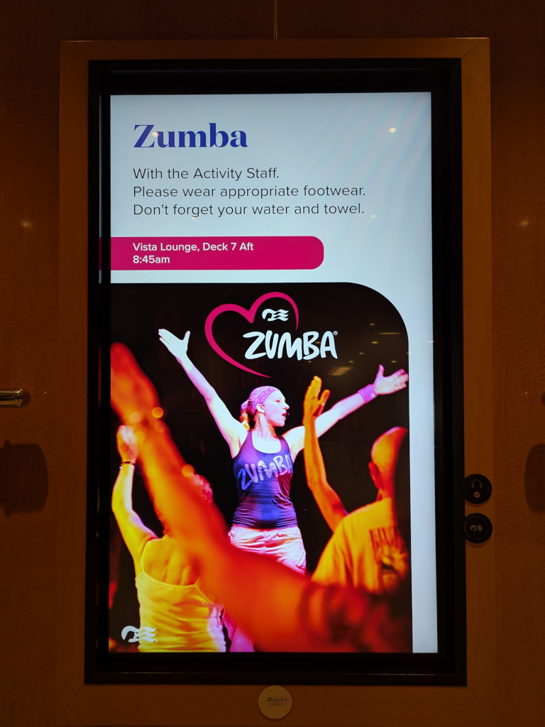 ![]() At 8:45, Mei-O went down to the Vista Lounge to participate in a 45 minute rather crowded Zumba class. |