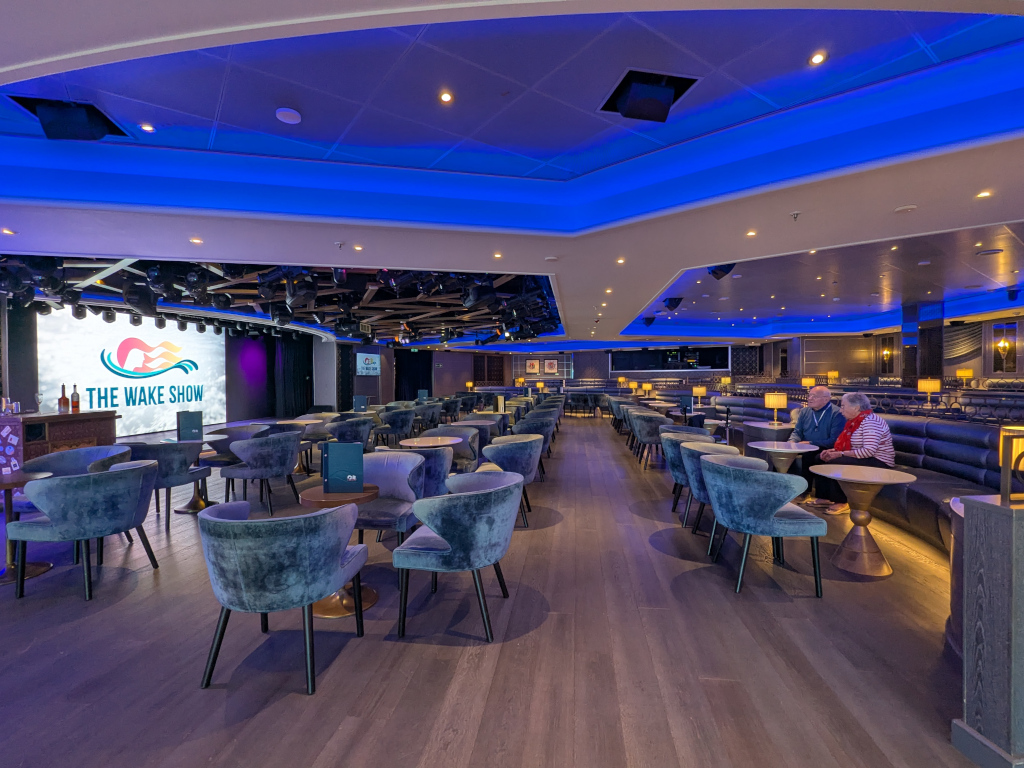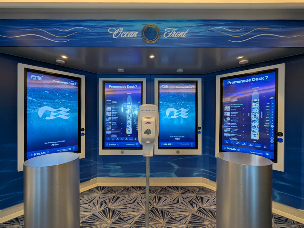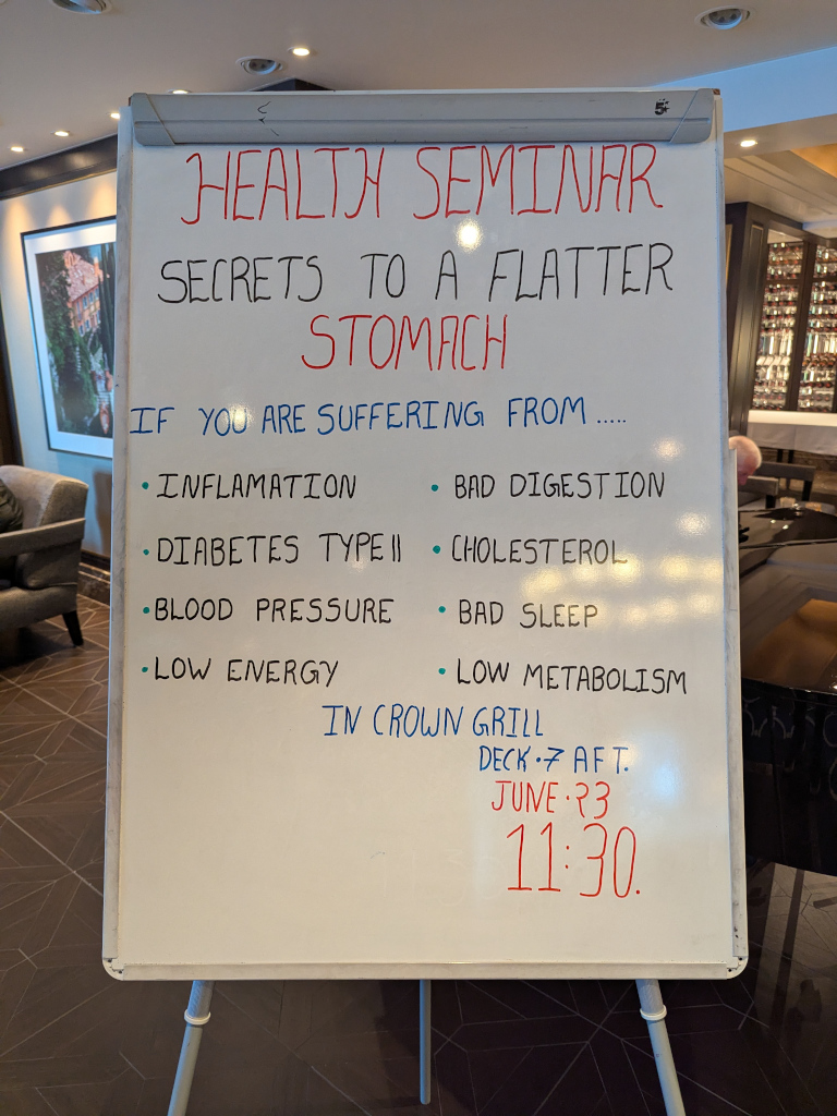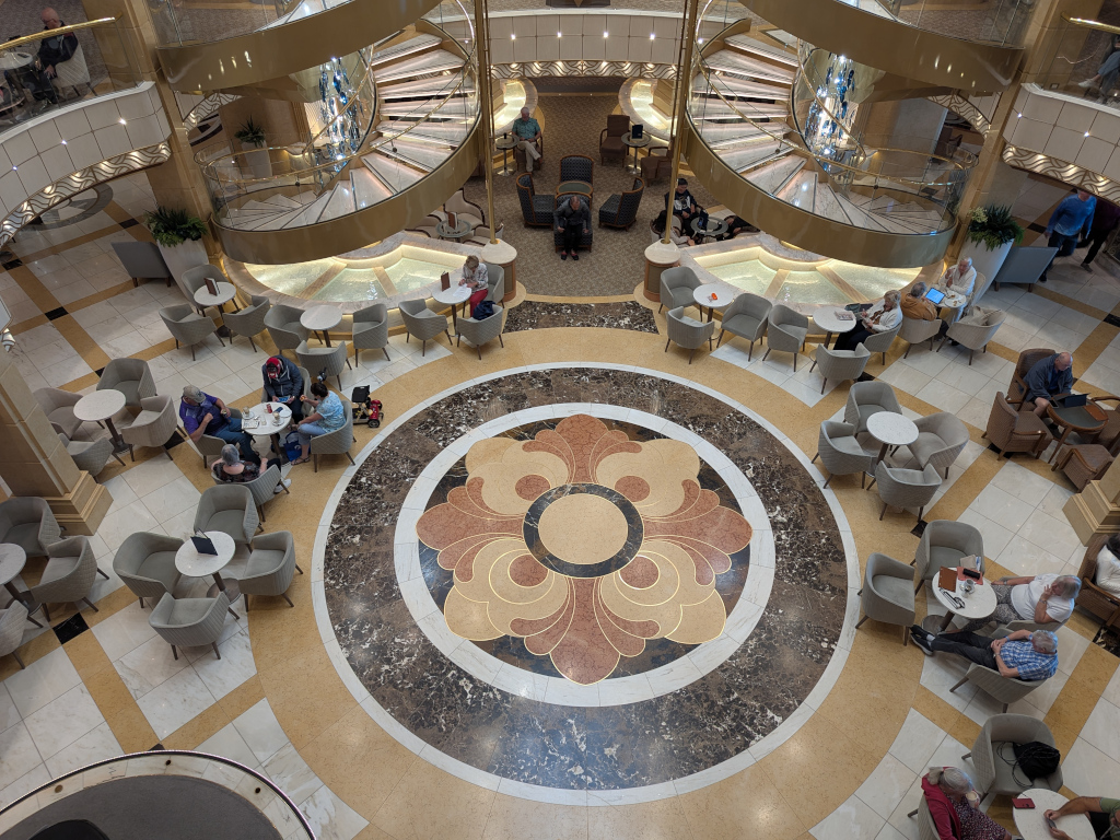 ![]() With Mei-O exercising in her 45-minute Zumba class, I just walked around the ship and took a bunch of random pictures; Maintenance was always going on all over the ship, classes and lectures were advertised trying to increase attendance, bars were empty, just waiting for guests to begin piling in a little later (it was still only about 9:00), people waiting in the Princess Live! lounge for the daily "Wake Show" to beginnote ended. The "Wake Show" was a daily TV show hosted by our Cruise Director, Dan, with infor- mation about various events go- ing on on the ship that day, in- terviews with crew members and staff, and all sorts of general information relevant to today on the ship. I didn't know what time it was produced live. |