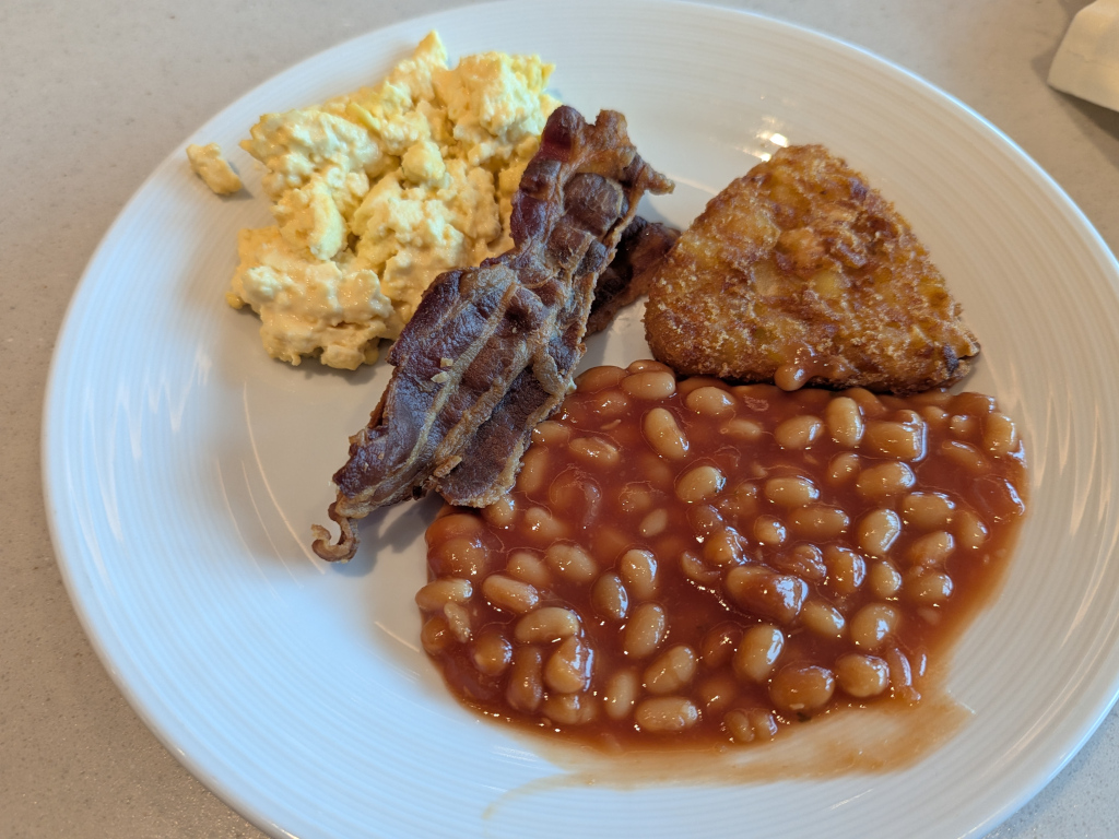 ![]() After everyone got to go back to their room to get cleaned up and relax a bit, around 9:30, we all met up at the buffet for breakfast. Today I threw a couple of strips of very well-done bacon (the way I like it) onto my breakfast plate, skipping the fish and continuing to enjoy the British breakfast staple, baked beans. |