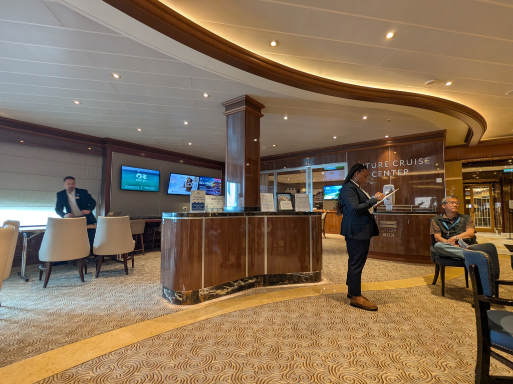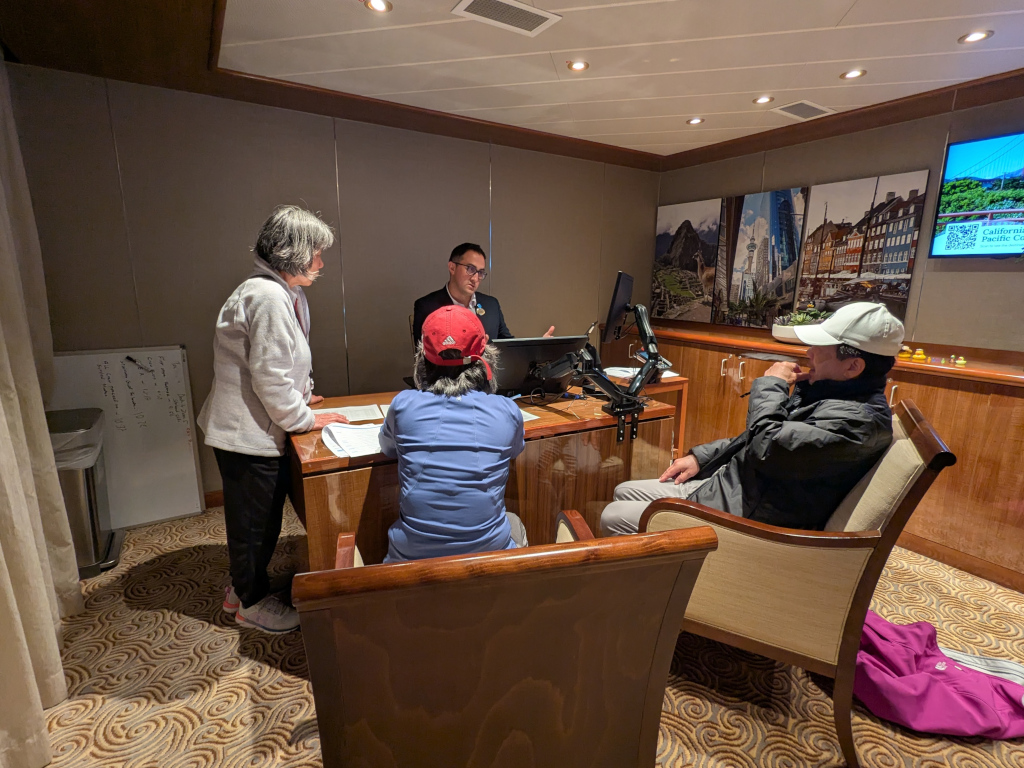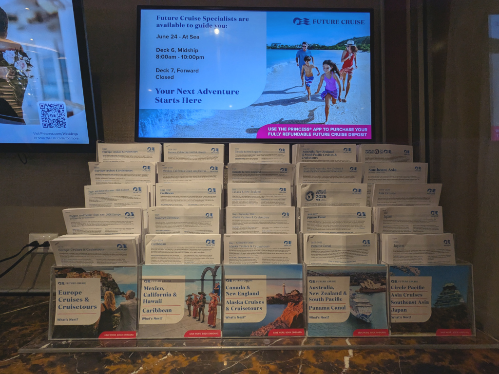 ![]() Then this caught our eye - the Future Cruise Center. This was our 12th cruise - Steve and Teresa had a few more - and if you book your next one on board (and we were pretty sure there'd be a next one), you can save a lot of money. So after looking at a few brochures, we sat down and talked with a future cruise specialist concentrating on a Japan cruise in the fall of next year. Though there were some good deals, we just weren't ready to decide on anything so far in the future, especially with my health issues. |