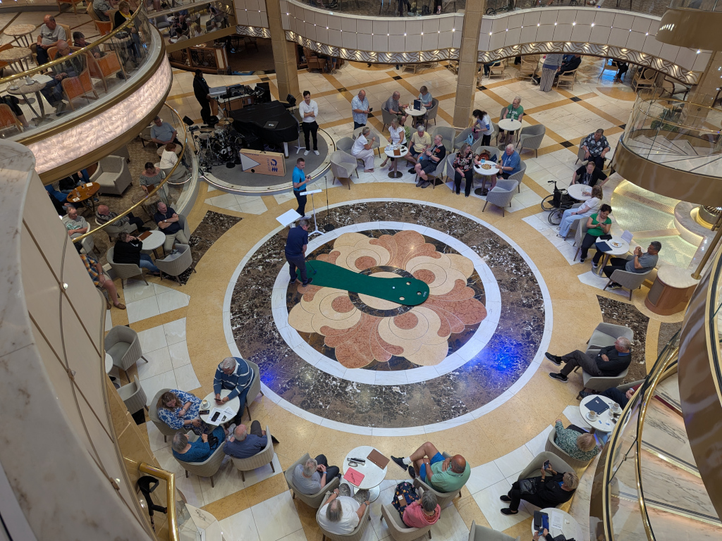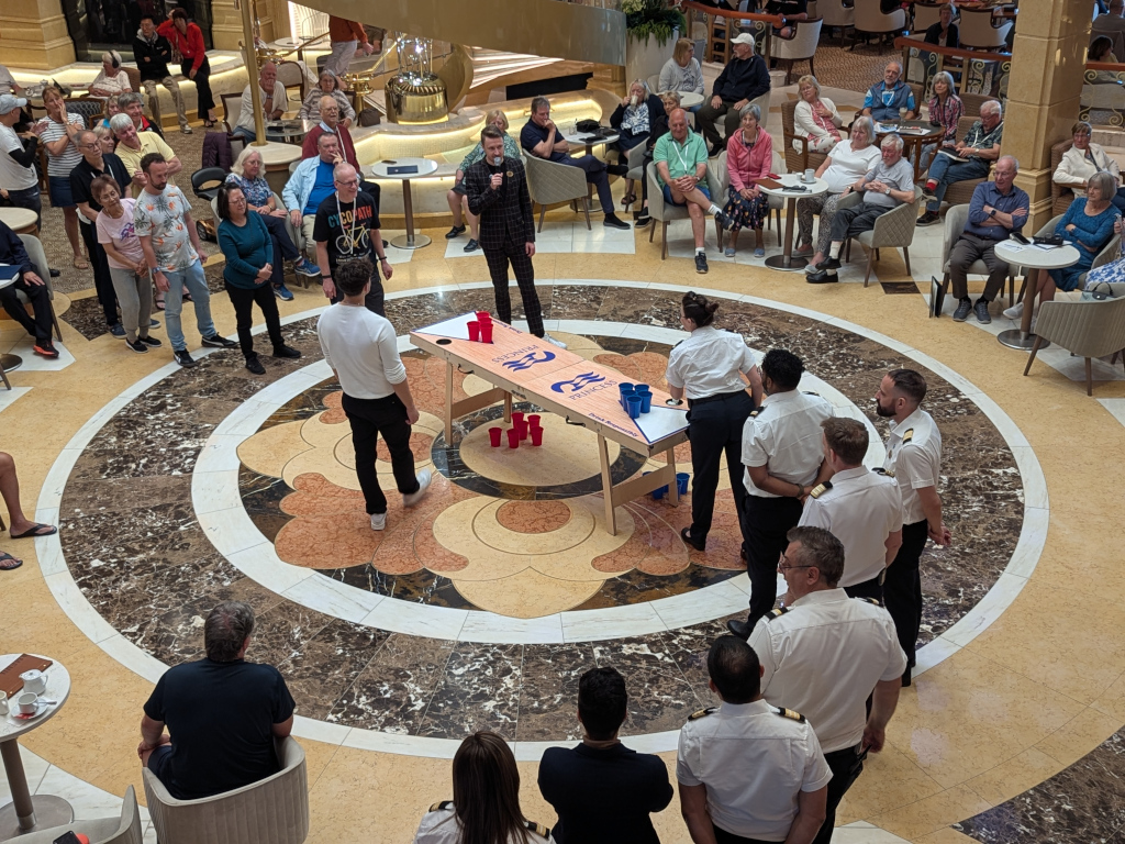 ![]() As we walked around the ship this morning, the Piazza was buzzing with activity. First, there was the Hole-in-One Golf Challenge, a competition between guests. Then, Officers vs. Guests Water Pong (you know, beer pong but with water instead.) I saw a couple of good shots, but we didn't stick around to see who won. |