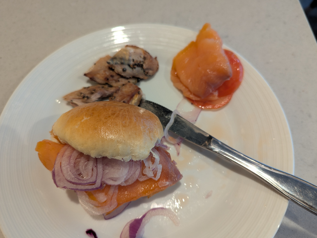![]() ...Look familiar? Another sandwich with lox, red onion, and tomato on a small roll and some smoked fish for breakfast. |