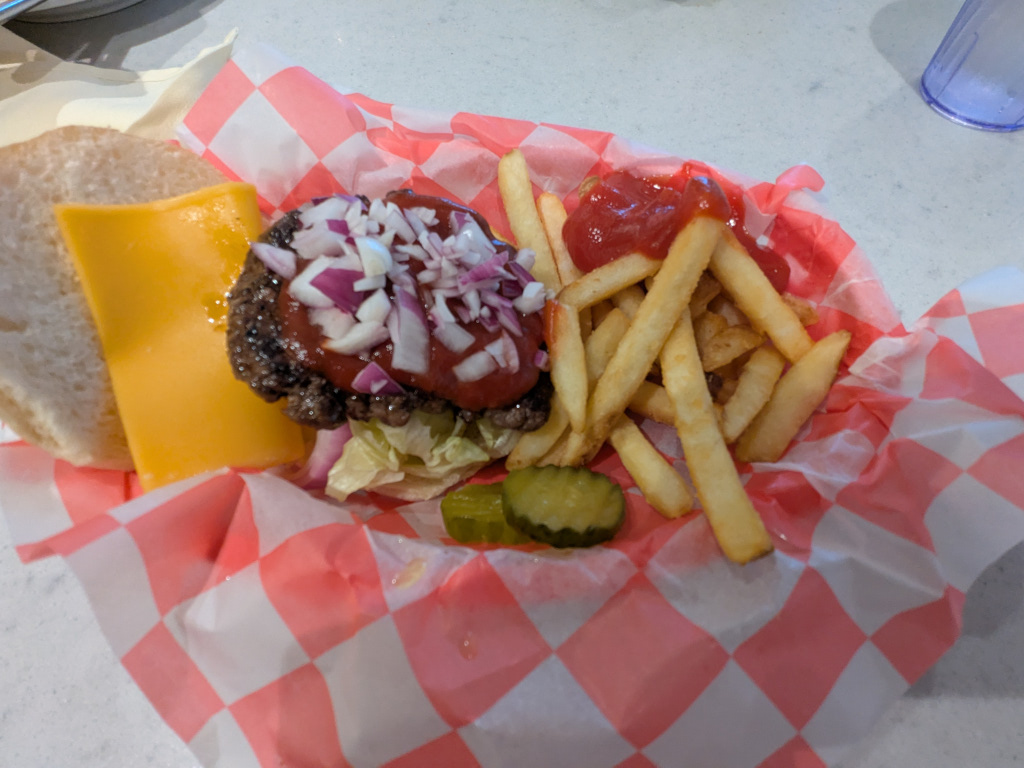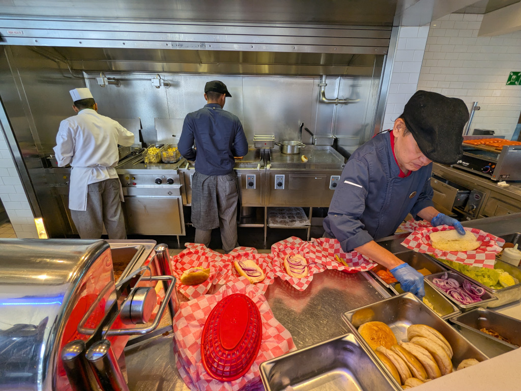 ![]() Back on the ship, we went back to our rooms, dropped off our jackets and backpacks, freshened up a bit, and met Teresa and Steve up on Deck 16 for lunch at the buffet. I started with a a small Caesar salad and some chicken wings, then decided this would be a good time to try something from the Salty Dog Grill across the pool deck opposite the buffet. They're basically a hamburger and hot dog joint; I ordered a cheeseburger which, despite the fact that they give you a hamburger and throw a piece of cold cheese on it, was really good. And their fries, fresh out of the deep fryer, were also good. (The fries are a popular item. As I waited for them to cook my hamburger, several people came by just wanting an order of fries, which required a constant supply of fresh ones, as they disappeared so quickly.) Next Top |