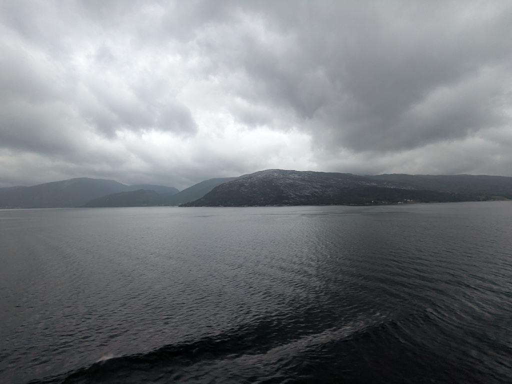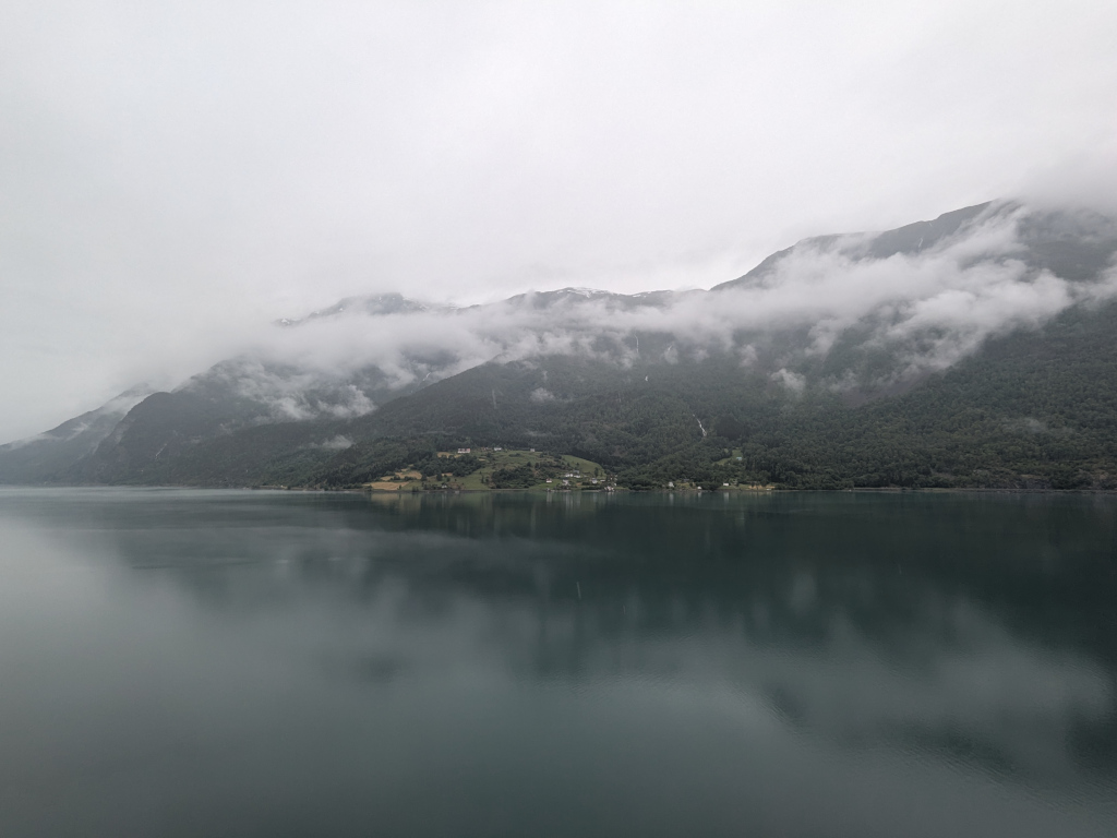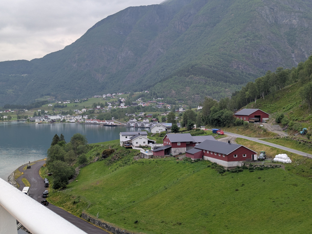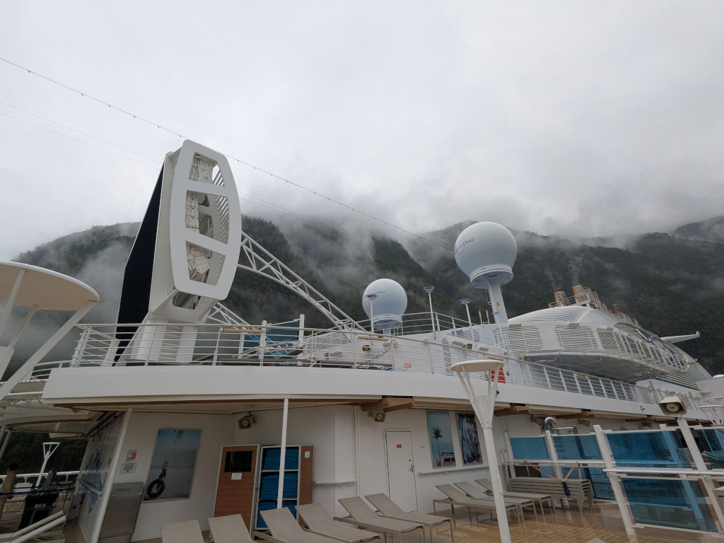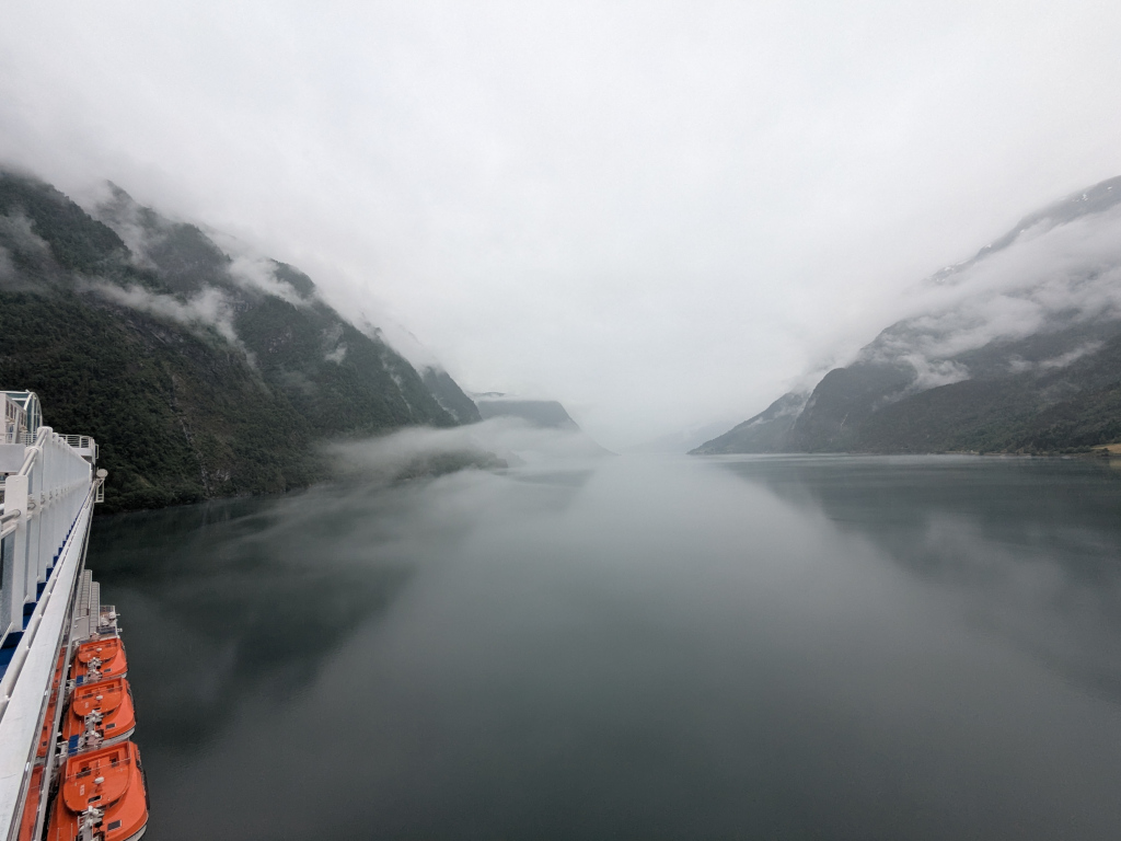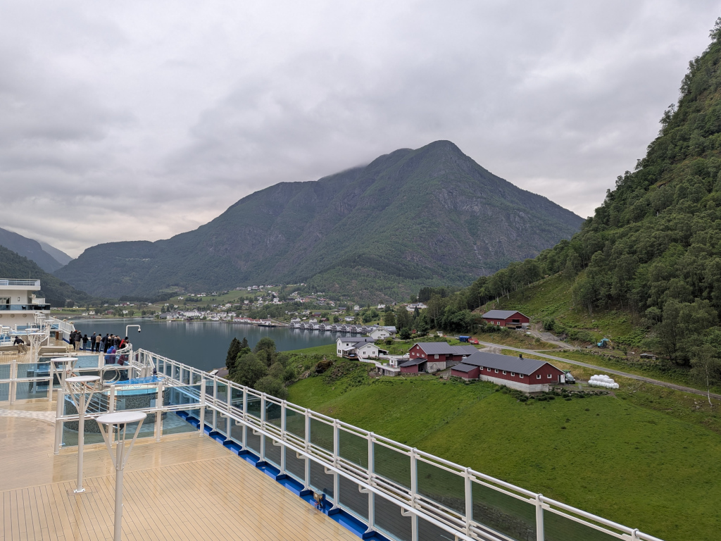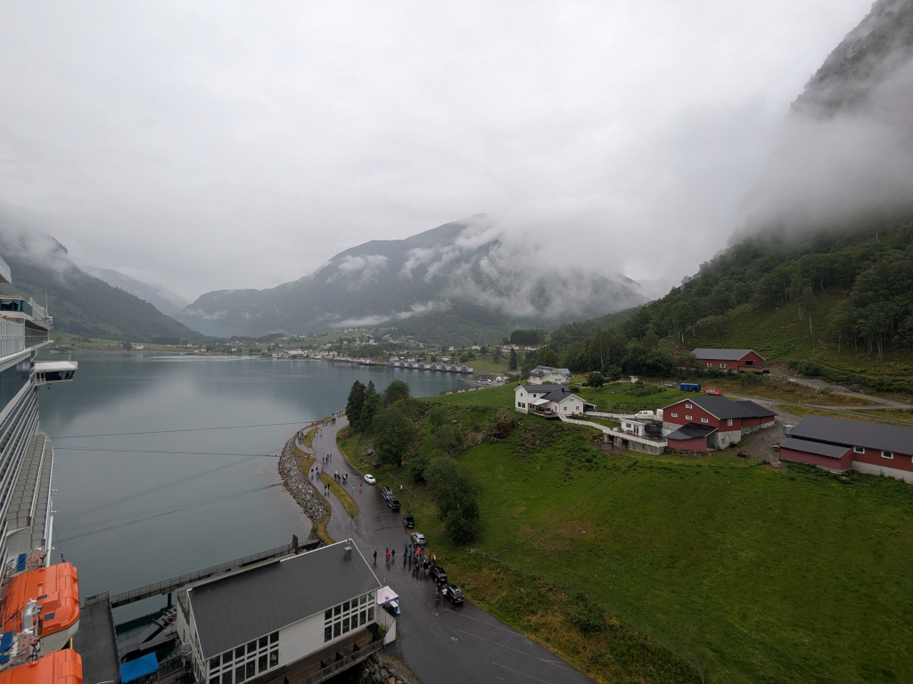 ![]() After breakfast, we went up on Deck 16 again to take a few more pictures as a light rain fell and clouds settled in on the town and the fjord - and on the ship and us. |