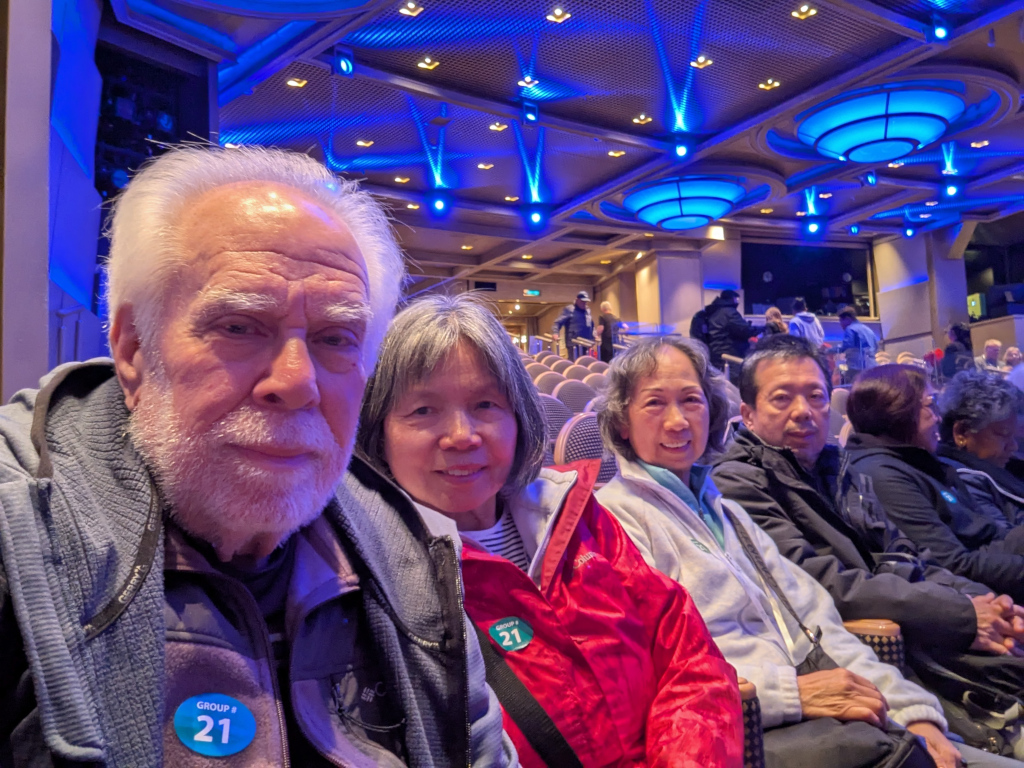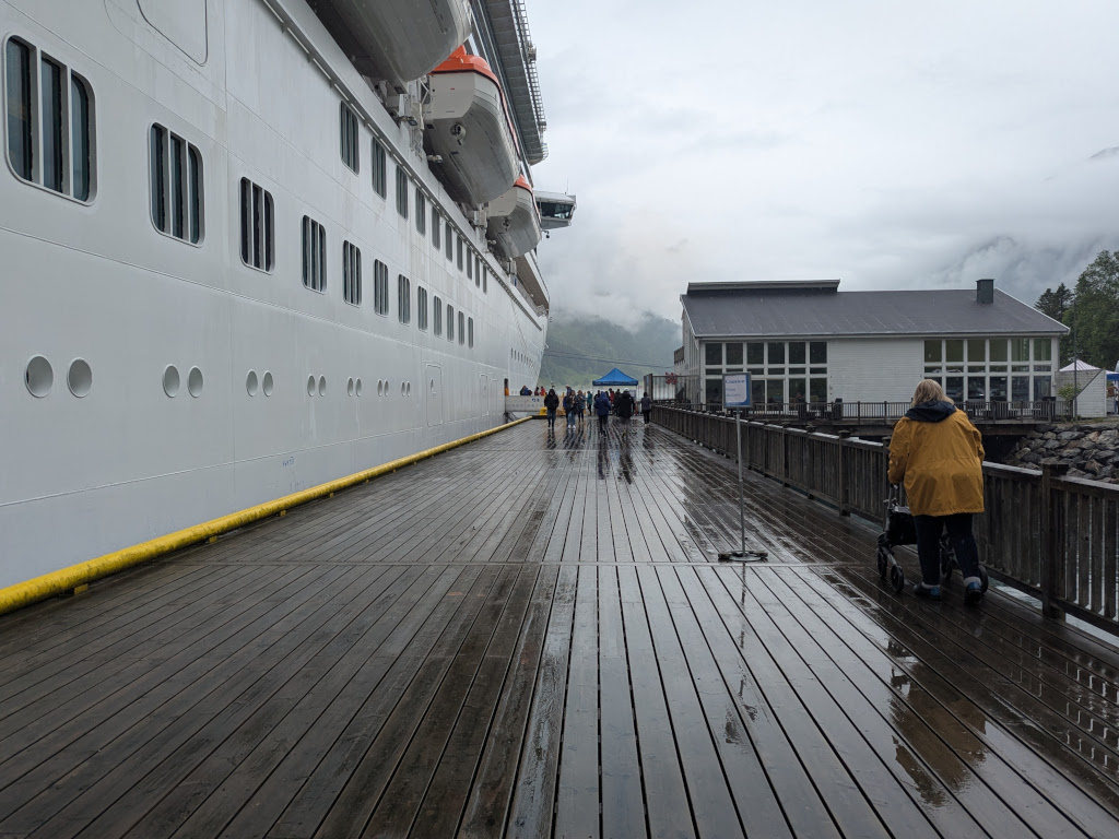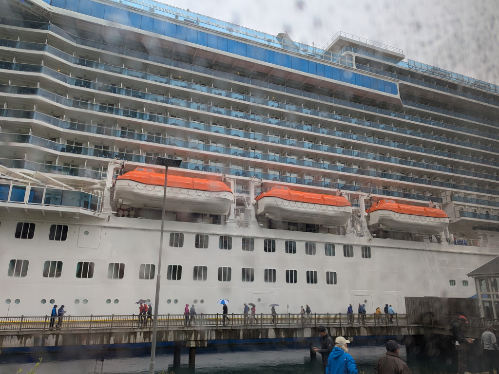 ![]() At 11:00, we all met up in the Princess Theater to be assigned to a group for our shore excursion. After about a half hour wait, our group number was called and we exited the ship onto a wet boardwalk on the pier. The light rain continued. | |