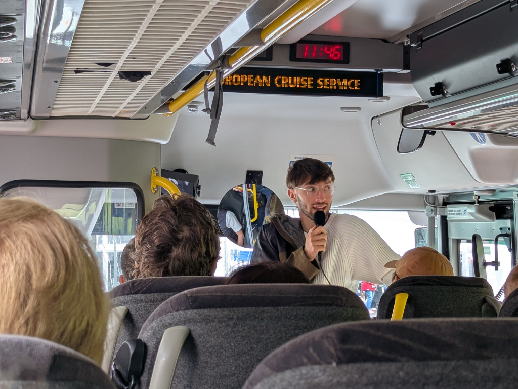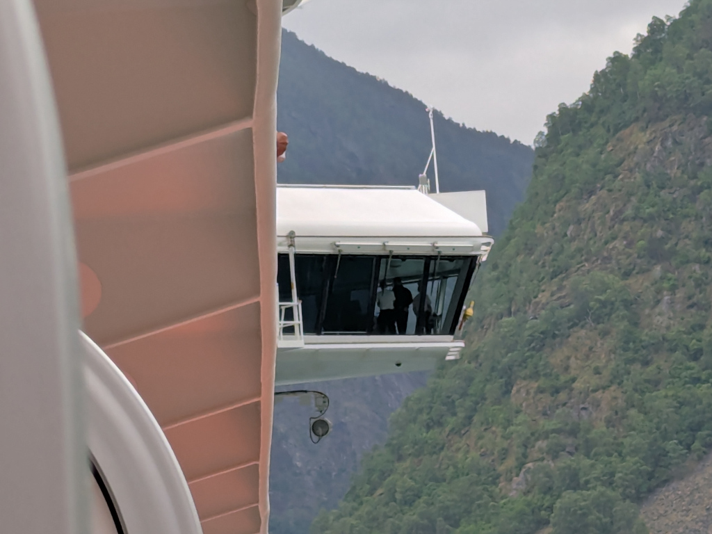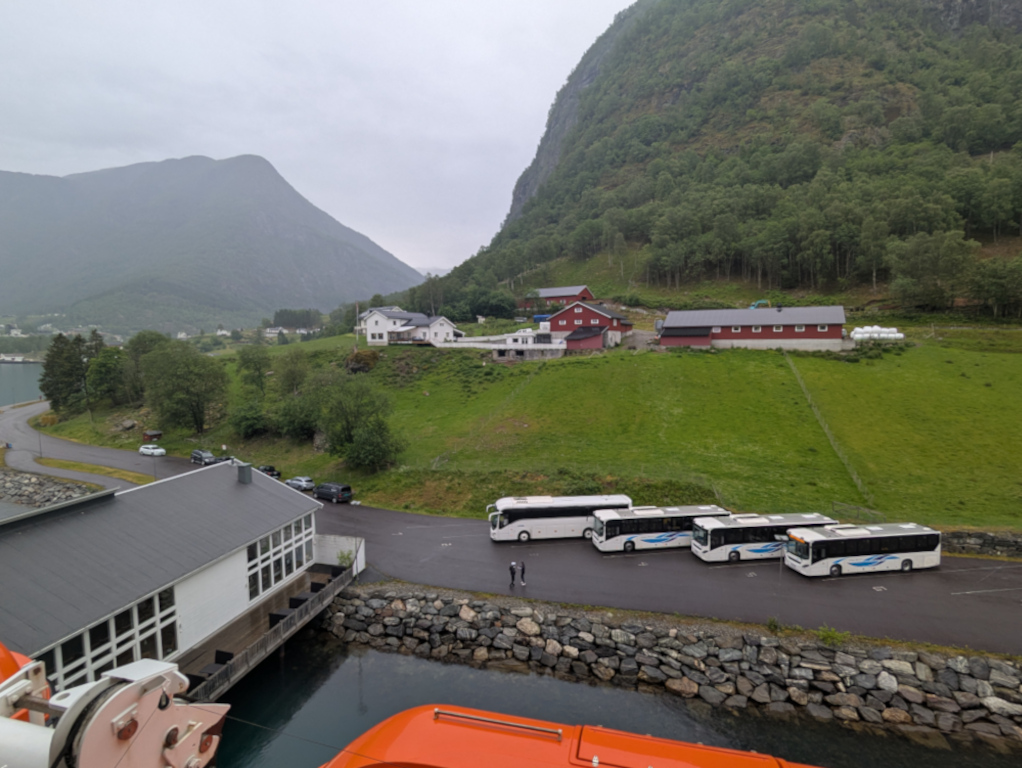 ![]() Around 6:15 AM we slowed to a crawl as the captain guided our 141,000 ton, 1,083 foot (330 meter) long ship into the dock at Skjolden as people watched from Deck 16 (while I was up on Deck 17). By 7:00, the ship was secured and the tour buses were waiting. |
