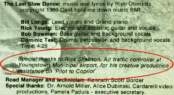 I got to meet the band at the Youngstown recording studio where they were cutting their first 33 1/3 rpm LP (the forerunner to CDs, for those who don't know), and went over the project with them. They played the song Pilot to Copilot for me, explaining to me where they needed my help and exactly what they wanted. I took the project home and worked on some dialog, working it into the words of the song between verses, and bringing it back to them a few weeks later. We did some refining and rehearsing, and, after filtering my voice through some electronic gadget to make it sound like I was talking over a radio, we laid down my whole track in one take. I would forever be immortalized on vinyl!
