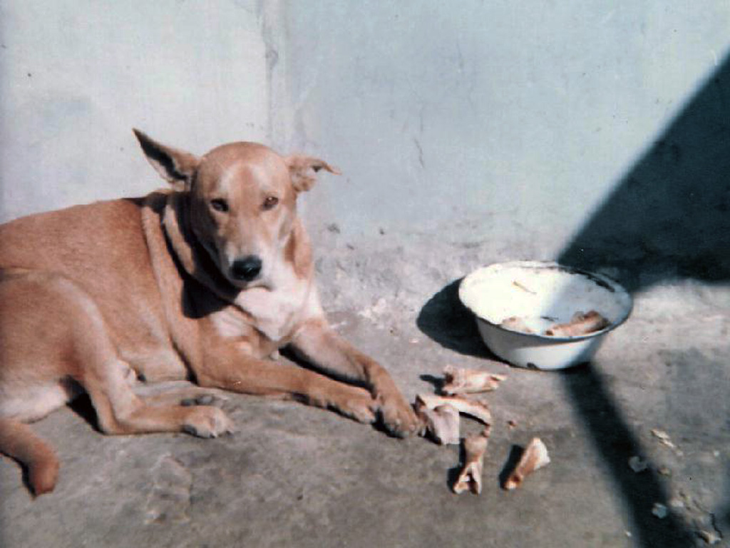 One day after a typhoon hit Taichung, we came home and noticed a little tiny black and white cat along side the road near where we parked our car. It couldn't have been more than a few weeks old (maybe just a few days old) and was soaking wet and lying very still, looking half dead. We took it home and cared for it and within a few days, we brought it back to life. As small and fragile as it was, we had to be pretty careful to keep Blue away from it, but we'd hold it up to the screen door for Blue to see and sniff. I think he was a little jealous at first, but after a while, as Tiger got older and bigger and stronger, we put the two of them together more and more, and they soon became good friends. They'd play together and we'd even find them sleeping together sometimes. This great friendship lasted for several years. After Mei-O and I left Taiwan, Blue and Tiger continued to live with Mei-O's family. One day, Tiger, who, like most cats was very free and independent, failed to come home. For several days there was no sign of him, and Blue (as Mei-O's sister Mei-Yu tells us) seemed very saddened, missing his friend a lot. Occasionally, Blue would sneak out of the yard and go off somewhere for a while (he wasn't allowed to run free outside very much, since free-running dogs were fair game for those who chose to catch them and eat them.) One day Mei-Yu followed him, and he led her to a bushy grove where Blue had been going to see Tiger's lifeless, now decaying body. Mei-O's mom came and recovered the body and buried it in a field near their house. They tell us Blue used to go there often and visit his old friend's grave. I can't verify this, since I never saw it happen, but that's what the family tells us, and I guess I've no reason to doubt it. DragonfliesThere are a lot of dragonflies in Taiwan, and Blue loved chasing them. He could actually jump quite high, straight up, nipping at them as they flew overhead, and he'd often catch one and eat it. While he was young and healthy, he never tired of chasing dragonflies. I suppose he built up some pretty good leg muscles, the way he could jump. He never chased anything else, just dragonflies. SuppertimeJust like Snoopy, when blue was hungry, he'd pick up his bowl in his mouth and stand by the screen door, waiting for someone to feed him. Sometimes, when he had to wait too long, he'd bang the bowl on the ground to let someone know it was feeding time. His diet, as with most dogs in Taiwan, was strictly leftover people-food, a mixture of rice, meat (usually beef, pork or chicken), fish, and vegetables, all left over from previous meals, all mixed together in a not-very-appetizing-to-people conglomeration, which he, being a dog and not a person, always seemed to love. His bowl was always licked clean. Blue's color (a light brown) turned out to be his curse. Dogs of his color were consider to be the tastiest, and we always had to be very careful to keep him in the yard. As he got older and wanted to 'sow his wild oats', Mei-O's mom found it very hard to keep him contained. She was so afraid he'd get out one day and end up on someone's dinner table that she had him castrated, so he wouldn't feel the need to run around the neighborhood looking for females. His castration really changed him. He got extremely lethargic and just laid around a lot and got really fat. But he also, and we don't know if this was related to the castration or not but it did occur at about the same time, developed a case of doggie-epilepsy. He would begin getting very nervous, pacing around frantically, then he'd fall down to the floor and have an epileptic-like fit, foaming at the mouth, banging his head and whole body noisily against the hard cement of the courtyard, and writhing in violent motion. This would occur at anytime, day or night, and pained us all to see him in such a state. Of course, we'd run to comfort him, and, especially when it was over, held and petted him to try to make him feel better. I remember those fits as one of the saddest things I've ever encountered, feeling so helpless watching my good friend suffer. I suppose here in the West, we would probably have put him down, but that wasn't an option for our family's pet in Taiwan. Everyone loved Blue so much, no one ever mentioned it. Hot Dog arrivesMei-yu tells us that later in Blue's life, their family got another dog. They named him Hot Dog, and he got along OK with Blue. The thing she remembers most is their feeding time. Each had his own bowl, and they were fed at the same time. But Blue always growled at Hot Dog and wouldn't let him eat until Blue was done, eating out of both bowls, yet always saving enough for Hot Dog. Blue was the elder, and he let Hot Dog know that that meant he was in charge. That seems pretty out of character for the Blue that I remember, so gentle and easy-going, but I suppose as he got older and sicker, he probably changed. But I still think of him the way I want to remember him, the way he was when I knew him, when he wouldn't hurt much more than a dragonfly. EpilogueBlue stayed with Mei-O's family after we left Taiwan in 1970. We saw him again when we went back to live in Taiwan from June of 1972 until June of 1973 while I was attending Tunghai University just outside of Taichung. He died sometime in 1974 or 1975 at only about five or six years of age. A NoteOn August 17, 2024, I was browsing through a sale e-mail from Costco when I ran across this picture: