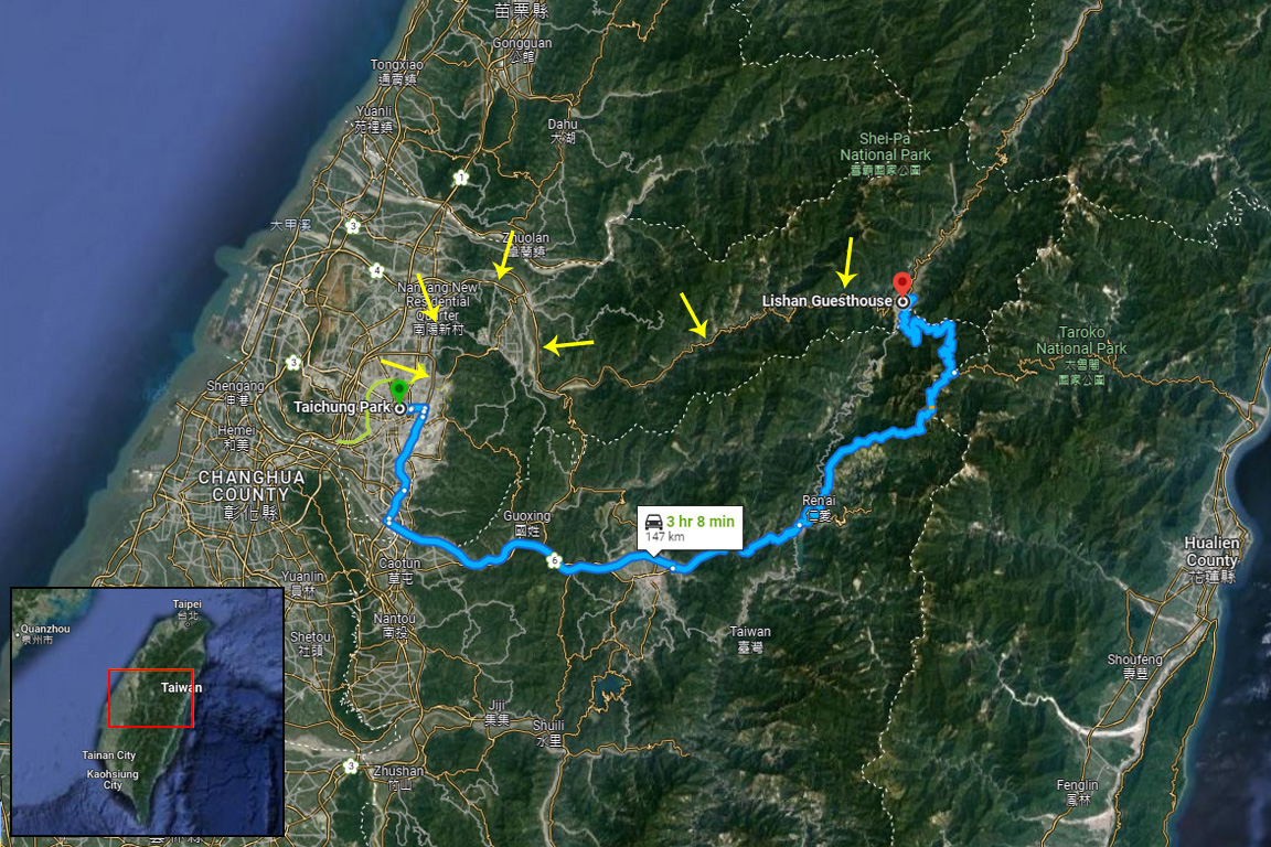 The trip progressed nicely, passing a major dam with its large emerald green reservoir behind it, taking us higher and higher into the mountains, eventually peaking at 1,900 meters (6,233 feet)! And the higher we got, the cooler it got. We were both wearing short sleeve shirts and Chris was wearing shorts, and as we neared Lishan, the mid-point of the cross-island highway (after about four hours bouncing along the road), we weren't very comfortable anymore. I decided to continue all the way to Lishan so we could rest, gas up, and get a bite to eat before making the return trip to Taichung. (There is not much along the cross-island highway once you get into the mountains until you get to Lishan.) We were getting quite hungry, this short little 10-mile trip turning into a day-long adventure, and I knew Lishan had a hotel with a restaurant. Unfortunately, the hotel's restaurant was pretty pricey (me having only five dollars, just about anywhere was pricey!), but we found an outside food stand along the highway that sold mantou (steamed buns) which we were able to afford, still leaving us some money for gas. We filled up on mantou, rested for a short while, filled up the tank, and then began the long trip home. Somewhere along the way home, Chris, seated behind me on the motorcycle, managed to get hit in the eye by something that caused swelling and redness that ended up looking like a bee sting. His eye was pretty much swollen shut, but he didn't complain any about it. And as the sun began sinking lower and lower in the sky, the temperature began to fall. I was really anxious to get out of the mountains where it would be much warmer, and really, really anxious to get back home where we could relax (the vibrations from the long motorcycle ride were beginning to take their toll on our legs and butts.) I drove pretty fast. Then the unthinkable happened. For no known reason, the motorcycle's engine died on us! We were still well up in the mountains, a long way from Taichung, cold, stiff, and somewhat sore. Chris' eye was swollen shut and I worried about it more and more every minute. I had absolutely no idea what to do. I kept kick-starting the bike, but it wouldn't turn over. We walked along the road thinking maybe the bike just needed a rest for a while. I'd try to flag down the next vehicle I saw, hopefully a truck so I could throw the motorcycle in the back (though there was little traffic on the cross-island highway that day), and see if we could get a ride back to any town where we might have been able to find a phone and call home for help. But nothing passed our way. I was really getting worried. Then a miracle happened. We stopped walking, and I tried to kick start the motorcycle again, and it started right up! We got on and sped home. From there on, the rest of the trip was uneventful, arriving home well after dark. When we got there, Mei-O and her mom were furious and panicky. Chris was cold (Mei-O tells me today that he caught a bad cold and was sick for several days, but I don't remember that), and his eye looked horrible. My whole body was sore and numb from the cold and vibrations. Fortunately, Chris' eye healed fine, we rested and recovered, and eventually, everything got back to normal. The whole trip really did turn out to be an adventure and a lot of fun. But to this day, Mei-O doesn't let me forget about it and how I made poor little Chris suffer so much. (Chris describes it as a lot of fun, too!) Admittedly, it probably was a little far to go with so little preparation and so little money, but it all turned out well in the end. Just another of life's little adventures, and a memory forever.... January 20, 2002 Postscript: The current modern road to Lishan can be seen on the map below (in blue), while the old Cross-Island Highway, the road we took and which is now more or less closed (see the last paragraph below), is indicated by the yellow arrows.